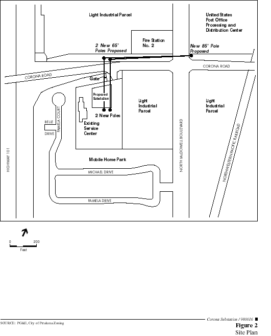 Location. PG&E’s proposed Corona Substation project would be located within its existing Petaluma Service Center at 210 Corona Road in the City of Petaluma. The Service Center occupies 3.87 acres, and the proposed substation would occupy 0.55 acres of that site (see