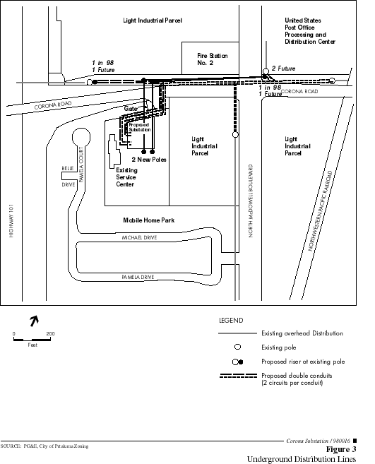 Proposed Facilities. The project consists of four elements: (A) a proposed substation within the Service Center site; (B) a 115 kV connector power line; (C) eight underground distribution lines; and (D) perimeter fencing and landscaping improvements and landscaping along Corona Road (PG&E, 1997, 1998a, 1998b).