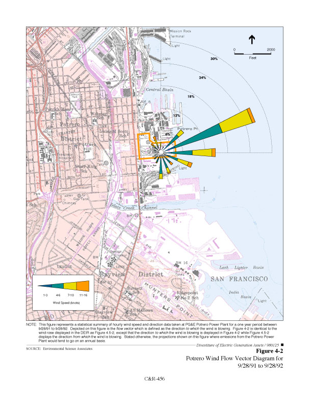 4-2 In response to the comment, a new figure has been prepared as suggested. Figure 4-2 shows the general vicinity of the Potrero Power Plant derived from topographic information similar to Figure 2.2 of the DEIR. To illustrate the requested effect, data used for the wind rose shown in Figure 4.5-2 of the DEIR has been superimposed over the Potrero Power Plant site to show the percent frequency of direction and wind speed to which the local winds blow. This is commonly referred to as the wind flow vector. Note this figure is the exact reverse of data provided on Figure 4.5-2 of the DEIR. As may be plainly seen in Figure 4-2, the predominate winds at the Potrero plant tend to cause airborne emissions to travel out over San Francisco Bay more than two-thirds of the time annually. The same figure shows that, about 7 percent of the time, winds tend towards the residential neighborhoods of Bayview/Hunters Point some 2.5 to 3 kilometers away from the Potrero Power Plant. As discussed in the response to Comment 1-9, the Bayview/Hunters Point area was the atmospheric dispersion model-predicted location of the point of maximum concentration from the Potrero Power Plant. Thus, Figure 4-2 amplifies this point and visually confirms the analysis of the DEIR.