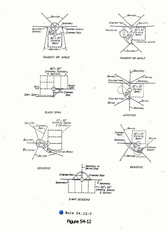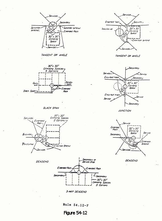 Related Extended Rack Construction and Other Types of Construction: Where conductors supported in extended rack construction are connected to conductors supported on other types of construction (crossarm etc.) climbing space shall be maintained in the same quadrant or on the same side of pole in accordance with climbing space requirements in Rules 54.7 , 54.9 , 54.10 or 54.12–F whichever is related to the climbing space selected.