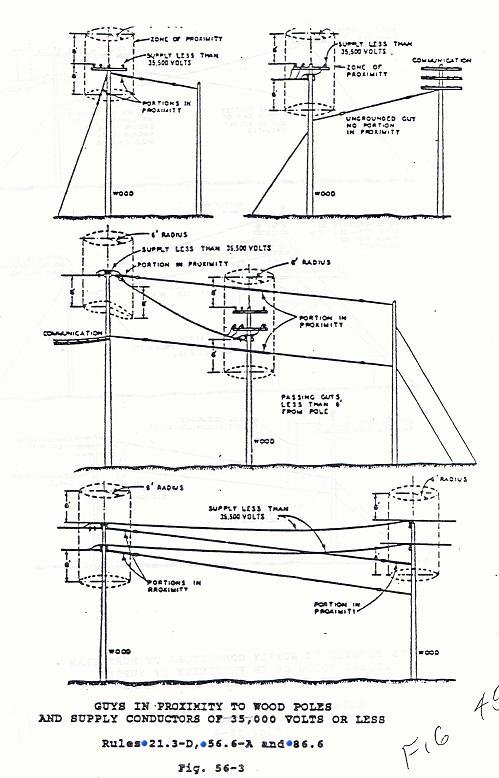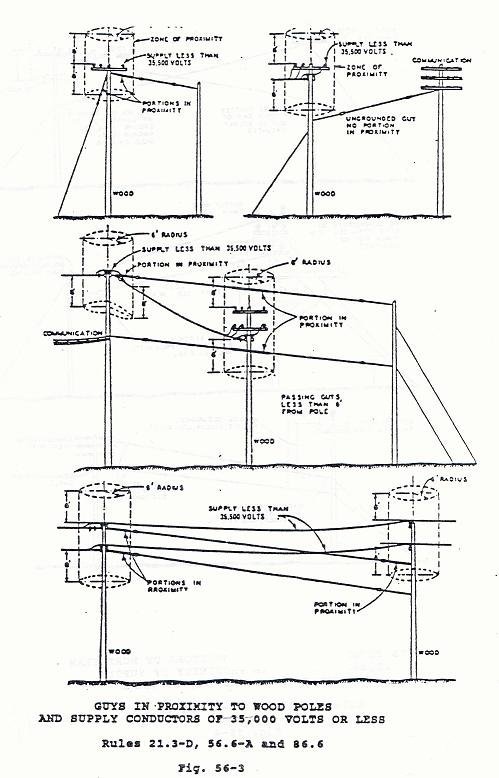 56.6-A. Guys in Proximity to Supply Conductors of Less Than 35,500 Volts (See Rule 21.3-D for definition of proximity and Fig 56-3)