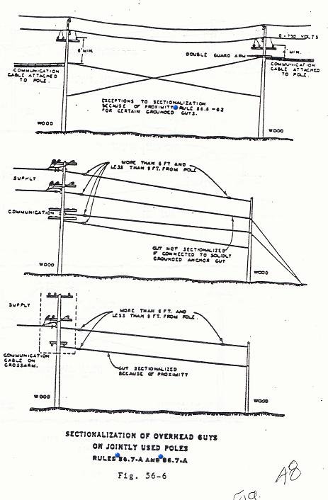 Overhead guys attached to wood poles, crossarms or structures and to grounded anchor guys or metal poles shall be sectionalized at not less than one location, 6 to 9 feet (measured along the guys) from the attachment at the wood pole or structure (Fig 56-5 and fig 56-6)