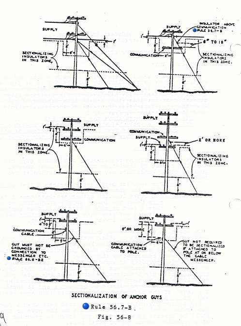 Ungrounded portions of anchor guys which pass through the level of communication conductors at positions other than between the pole and pole pin positions or outside of the outer pin position shall be sectionalized by insulators placed between 6 and 18 inches above the level of the communication conductors (see Fig. 56-9).
