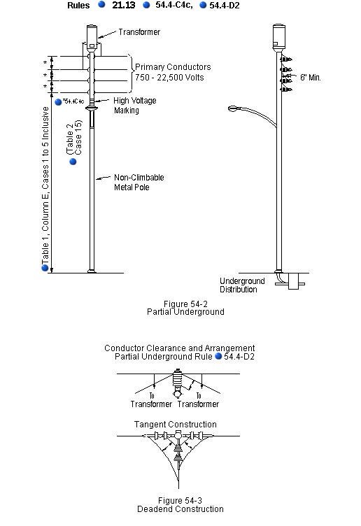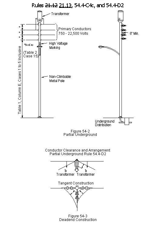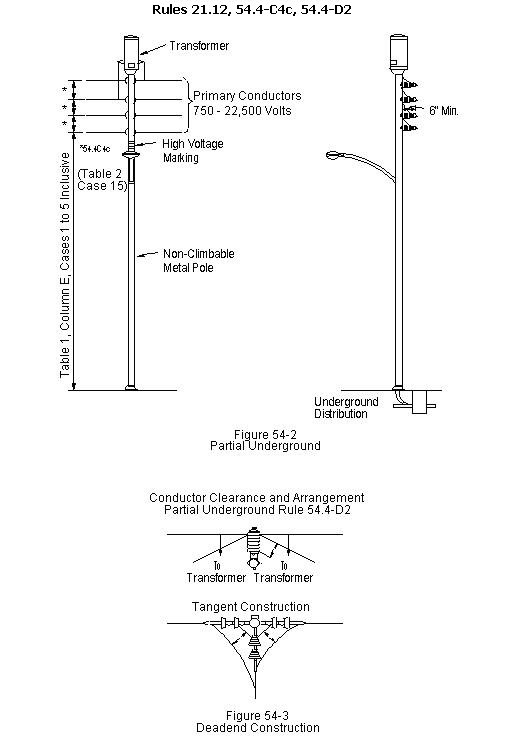 54.4-C4c)    Conductors of More than 750 Volts supported on non-climbable pole: Where conductors of more than 750 volts are supported in vertical configuration on non-climbable poles in partial underground distribution at line terminations, angles, or corners, the following requirements apply: