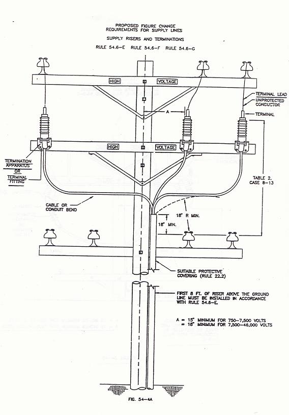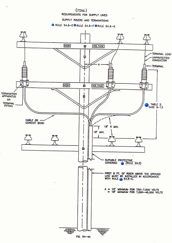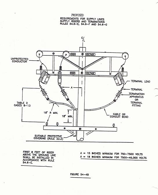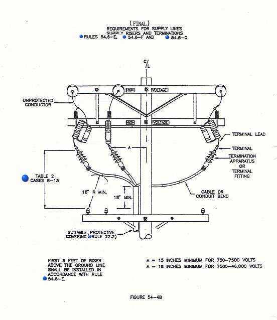 (4) Vertical and Radial Clearances From Conductor Below: All exposed grounded surfaces of; terminals, terminal fittings, weather heads, cables or bends, or suitably insulated cable surfaces of risers and runs shall be at least 18 inches vertically and 18 inches radially from the next unprotected conductor level below. (See Fig. 54-4 A & B).
