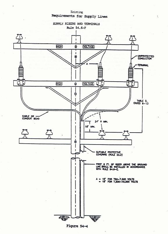 (6) Exposed Suitably Insulated or Grounded Surfaces: Exposed suitably insulated or grounded portions of cable, conduit bends, terminal fittings, terminals, and weather heads, located at the upper end of vertical runs or risers supported on climbable poles or structures should be arranged with as little exposed surface as practicable. Such cable or conduit bends are not required to be covered by a suitable protective covering (See Figure 54-4 A & B) provided that no portion of their exposed surfaces are within the climbing space.