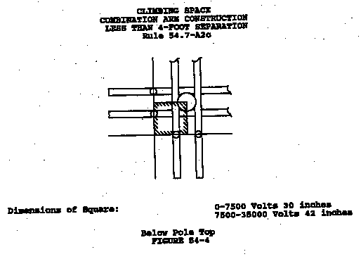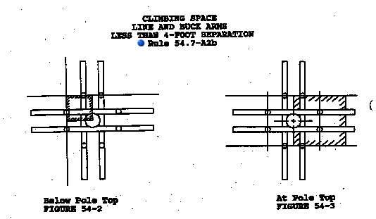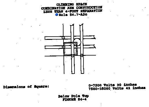 b) Where the Vertical Clearance Between Conductors on Line and Buck Arms is Less Than Four Feet: The climbing space shall be provided through such levels and located in a quadrant and shall have at least the following dimensions (See Figure 54-2.)