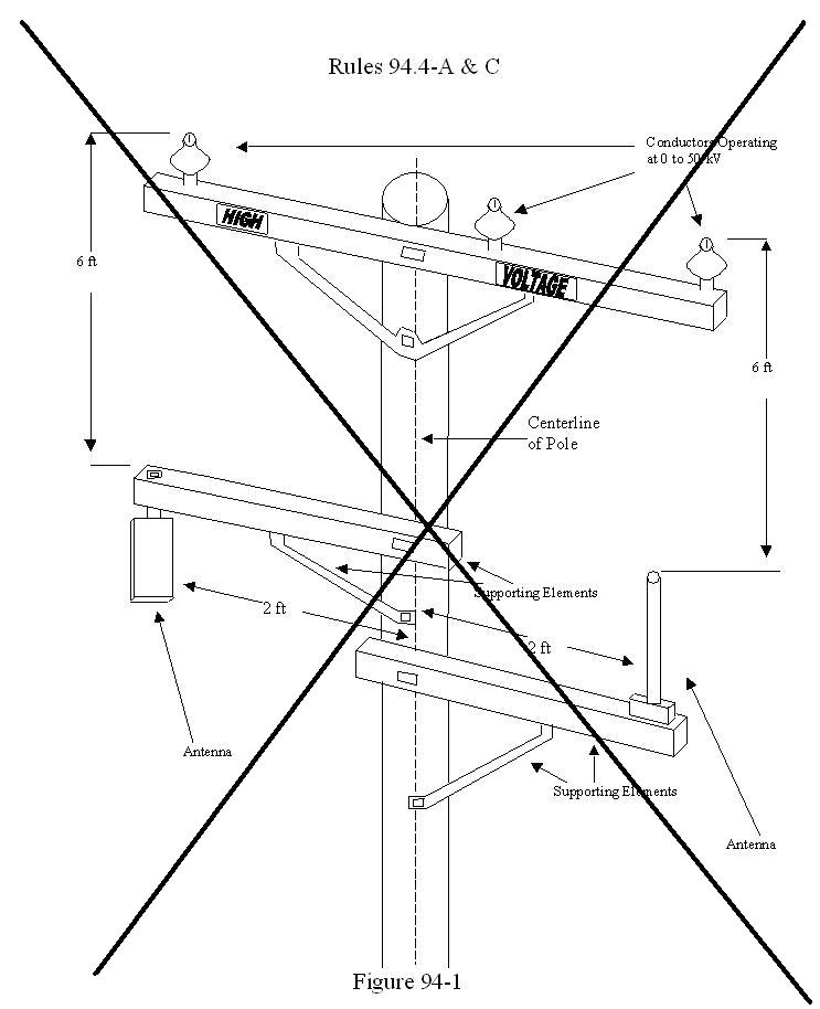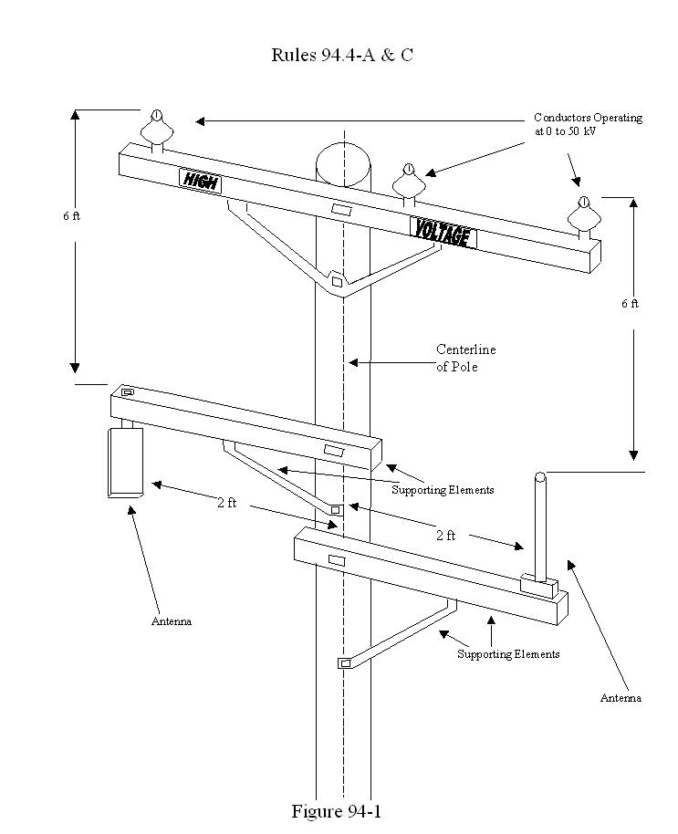 A. Antennas and supporting elements below supply lines shallmaintain a vertical clearance of 6 feet from Supply Conductors operating at 0 – 50kV. (See Figure 94-1)