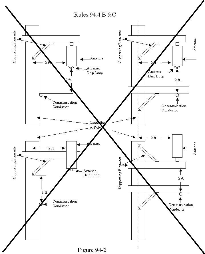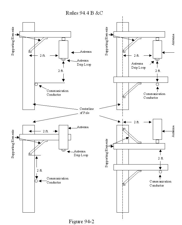 E. Antennas shall maintain a 2 ft.horizontal clearance from centerline of pole when affixed between supply and communication lines or below communication lines. (See Figure 94-1)