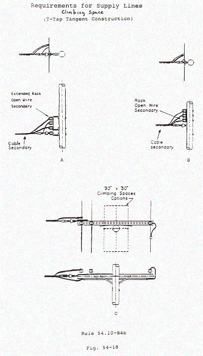 (5) Arrangement for Deadend Construction: On poles with the messenger deadended in more than one direction, the grounded messenger or insulated phase conductors of the multiconductor cable shall not be attached to more than two sides of the pole and shall not be less than 2.5 inches from the surface of the pole. The climbing space shall be determined by Rule 54.10–F. (see Figure 54–17).