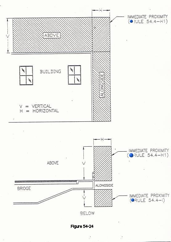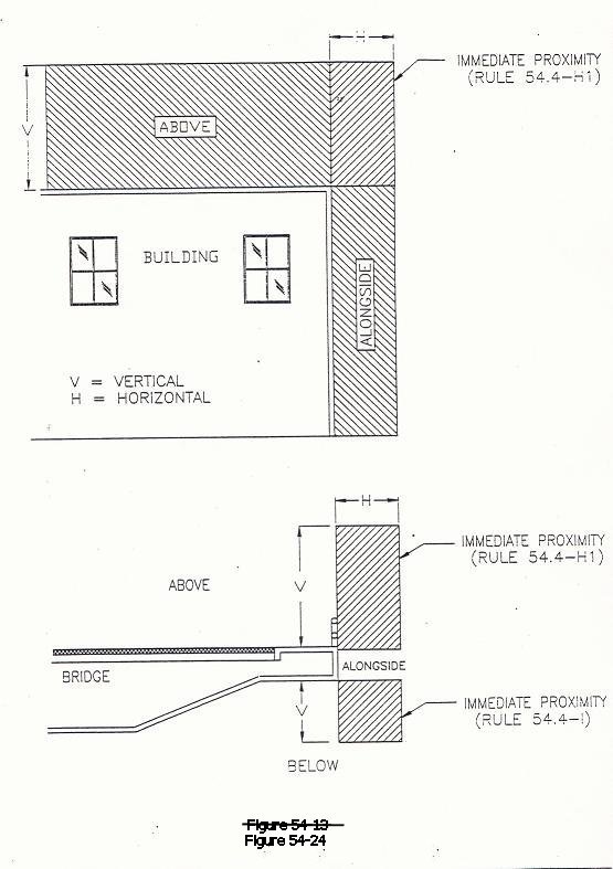 Unprotected supply conductors which pass unattached below or in immediate proximity to bridges, viaducts or similar structures shall be maintained at clearances above ground and walkways as specified in Table 1, Cases 1 to 6 inclusive; at clearances from walls and underneath parts of such structures as specified in Table 1, Case 7; and at clearances from conductors of other classifications as specified in Table 2, Case 3. The horizontal clearance (Table 1, Case 7) shall be maintained until the vertical clearance (Table 1, Case 6) is attained (see Fig. 54-24).