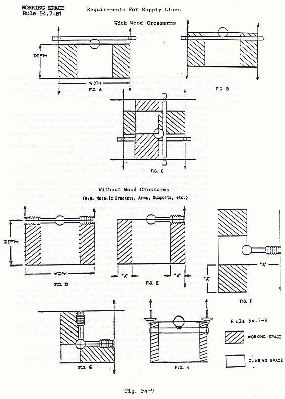 Working spaces, unobstructed by conductors or other equipment except as provided in Rule 54.7-B2, of the dimensions as specified in Rule 54.7-B1, shall be provided between supply conductor levels on all poles and in such positions that the working spaces include the climbing space.