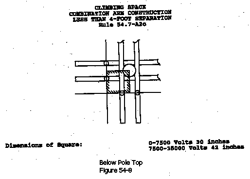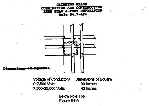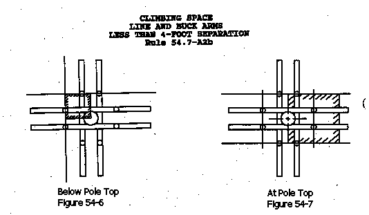 b) Where the Vertical Clearance Between Conductors on Line and Buck Arms is Less Than Four Feet: The climbing-space shall be provided through such levels and located in a quadrant and shall have at least the following dimensions (See Figure 54-6).