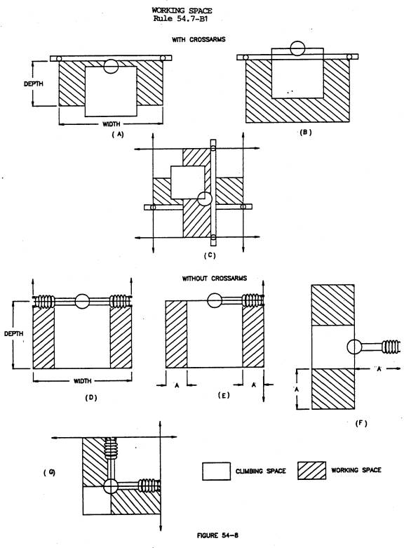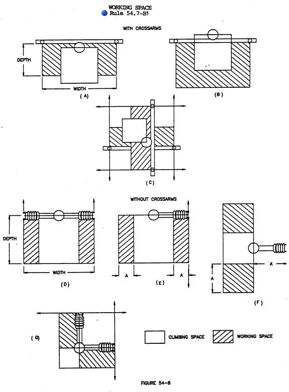 54.7-B. Working Spaces, unobstructed by conductors or other equipment except as provided in Rule 54.7-B2, of the dimensions as specified in Rule 54.7-B1, shall be provided dimensions as specified in Rule 54.7-B1, Shall be provided between conductor levels on all poles in such positions that the working levels on all poles and in such positions that the working space include the climbing space.
