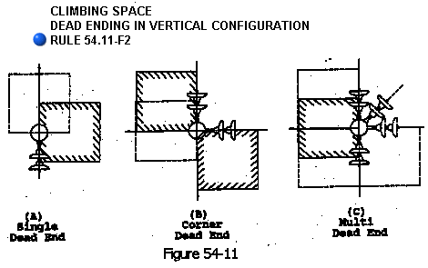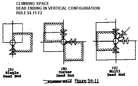 (2) Dimensions Where Conductors Are Dead-ended In vertical Configuration: Climbing space through conductors shall be a square of the horizontal dimensions tabulated below, and shall be located either on one side or a quadrant of the pole (See Figure 54-11.).